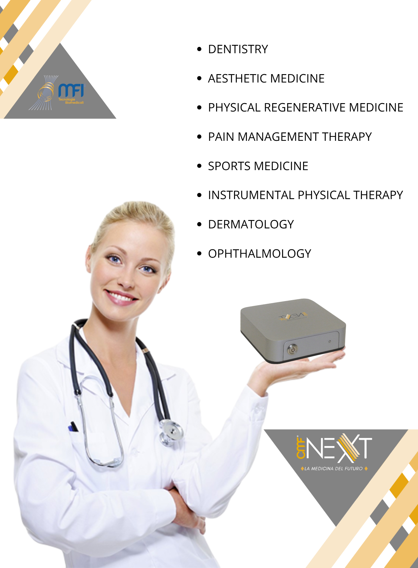 Founded in 2007, MFI Srl is a unique company in the healthcare electromedical equipment sector. Thanks to our experience and innovative CMF solutions, we offer top-quality medical devices for rehabilitation and pain management, ensuring maximum patient well-being.